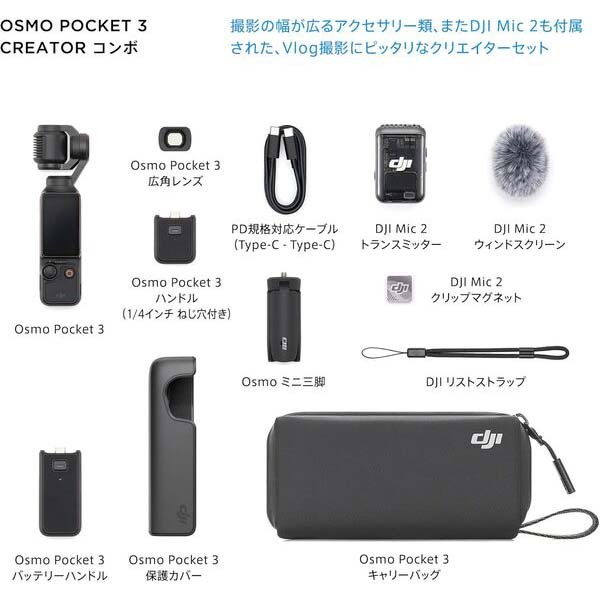 付属品‎DJI リストストラップ *1, Osmo Pocket 3 *1, Osmo Pocket 3 ハンドル(1/4インチ ねじ穴付き) *1, Osmo Pocket 3 保護カバー *1, PD規格対応ケーブル(Type-C - Type-C) *1