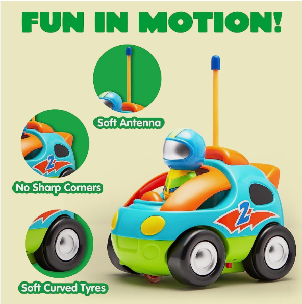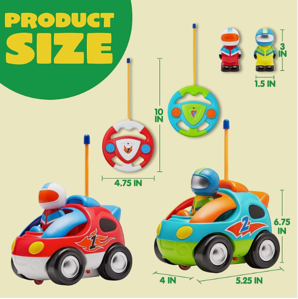 • Race Car Radio Control Toddler Cars Includes 2 Cartoon Radio Control Race Cars with Music and Sound Features, 2 Different Removable Action Figures and 2 Remote Controls with Forward and Reverse Left Channels.