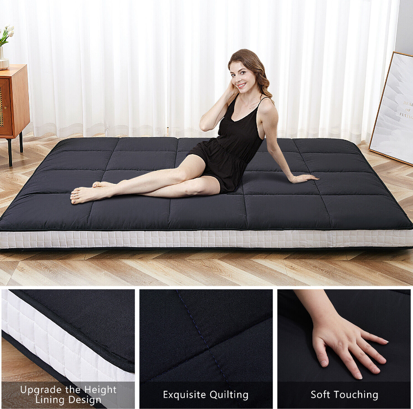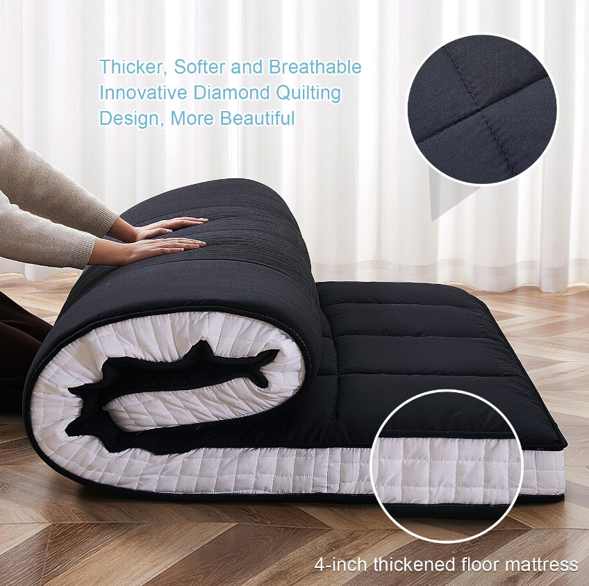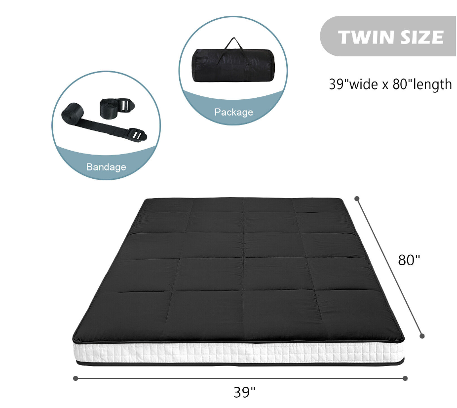 ▶ 【COVER MATERIAL】:Microfiber| Filling Material: Polyester + Memory Foam, Twin Size: 4" thick x 39" wide x 80" long, Weight: 10 lbs ▶ 【UPGRADED EXCELLENT WORKMANSHIP】:The thickness of the futon mattress before quilting is nearly 17 cm. The top and bottom layer are 6cm thickness polyester filling, the middle layer is 5cm thickness high quality memory foam. We have upgraded the middler layer so that the futon mattress will not collapse easily, memory foam will offer a better support when you lying on the mattress. After the quilting the original thickness of the mattress is about 8-10 cm. ▶ 【WAHT INCLUDED IN THE PACKAGE】:Buy 1 futon mattress, you can get the 1 same color mattress dustproof cover, 1 pair of bandage, 1 storage bag. With the dustproof cover, you will no longer have to worry about the clean issue of the mattress, which can greatly improve the durability of the mattress. For better storage and carrying, the mattress are equipped with straps and storage bag. ▶ 【WIDE VERSATILITY】:It can be used as Bedroom Futon/Living Room Futon/Tatami Mat/Floor Mattress/Sleeping Floor mat/Tent Mat/Guest Mattress/Japanese Bed Mat, also can be kids play mat/floor pillow bed, also bring it with you in your car when going to anywhere, it is a good accompany for your family, Just Enjoy Your Leisure Time with Japanese Floor Mattress. ▶ 【IMPORTANT NOTICE】:Please Dry The Floor Mattress Under the Sun Firstly, it will be recovered more quickly in the sunshine. Please kindly be noticed that we compress the futon mattress into a storage bag for transportation, so please allow at least 2-3 days to recover the thickness. Advantages: The 10-12cm futon mattress is soft and comfortable, and breathable. It's able to be rolled up to keep in closet and rolled out right on the floor to sleep on. It makes for an efficient use of living space and storage, easily to move. The thick tatami mat can be used in multi purposes such as picnics, visitors, children playing games, taking a rest, massage, yoga, exercise.